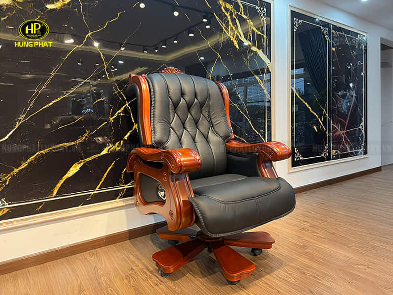- Thiết kế sang trọng, hiện đại với màu đen thể hiện sự uy quyền. Tay ghế có kiểu dáng mềm mại tạo điểm nhấn cho sản phẩm. Sự phối hợp tinh tế giữa màu đen của da và màu nâu của gỗ càng tăng thêm vẻ đẹp và tính thời thượng cho ghế.